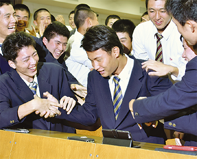 同日、高校の多目的教室で野球部員約50人とスマートフォンで結果を見守った森山選手。指名の情報が流れると、集まった部員から歓声があがり、「おめでとう」「やったな」と声をかけられ、はにかんだ笑顔を見せた。