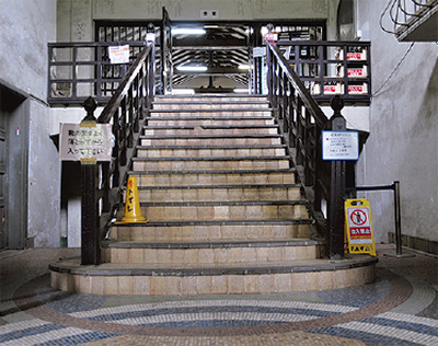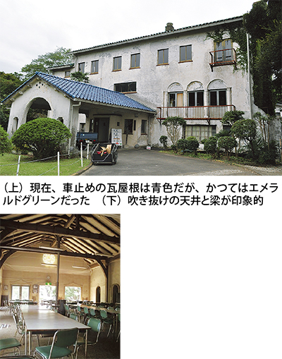 建物はスパニッシュ様式の瀟洒(しょうしゃ)な造り。屋根瓦が緑色だったことから「グリーンハウス」と呼ばれた。当時は2階右手が食堂、中央部は広いラウンジで、中央には大きな暖炉やバーカウンターも備わっていた。床など随所に、洒落たモザイクタイル(=上写真)が利用されている。