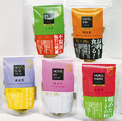 構想から3年―。ようやく販売にこぎつけたのは、身体への作用が異なる漢方茶5種類。ダイエット中にふさわしい「細美(ほそみ)茶」、沖縄では「眠り草」と呼ばれるクワンソウをベースに睡眠前に最適な「夢来(むく)茶」。外食が多い人におすすめの「黒脂(こくし)茶」。体を温める生姜や陳皮入りの「温盛(ぬくもり)茶」、ストレスを抱える人にぴったりな「出得(でとく)茶」など、漢字と響きをアレンジしたネーミングやポップなパッケージには、2人の遊び心も垣間見える。