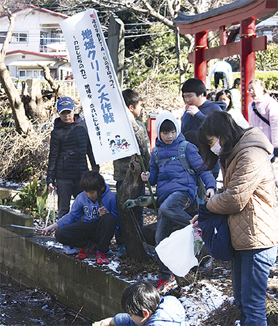 明治小学校のPTAからなる杉の子山クラブ(おやじの会)と児童らは2月11日、同校近隣を流れる引地川沿いの清掃活動「クリーン作戦」を実施した。
