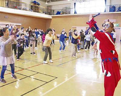 当日は同所を管理する(社福)光友会の利用者ら約120人が参加。「キュンとするまち。藤沢」の公式マスコットキャラクター「ふじキュン♡」や講師として振付演出家の南流石さんが登場し、元気な掛け声と身振り手振りでダンスをレクチャー。参加者全員で身体を動かして楽しんだ。