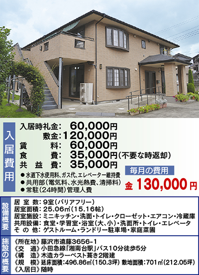 同施設では見学を随時受付中。施設へは湘南台駅よりバスで10分。駐車場も完備しているので、車での来場も可能。「お電話いただければいつでもご案内します」と同施設。詳細は左記までお気軽に。