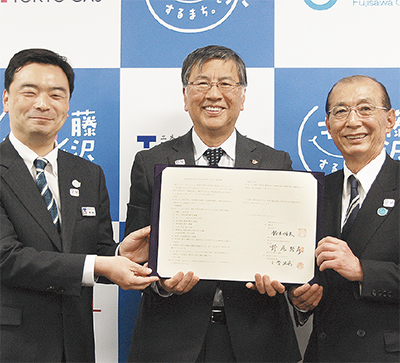 同日、藤澤浮世絵館で協定調印式が行われ、鈴木恒夫市長と野尾支店長、小菅社長が出席した。