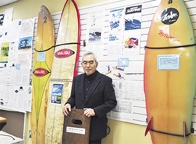 企画展では、戦後、米国の雑誌でサーフライディングの様を見た少年(内藤喜嗣同室副運営委員長)が、木製のボードを手作りしたエピソードや、1960年代、湘南学園高校の佐賀亜光さん兄弟らが日本初のサーファー組織「サーフィングシャークス」を結成した経緯、当時のサーフボードの展示を通じて、鵠沼のサーフィン文化をたどる。