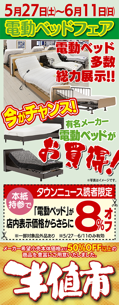 「ルームズ大正堂つじどう店」では、5月27日(土)〜6月11日(日)、豊富な種類の電動ベッドを一堂に集めた「電動ベッドフェア」を開催する。将来のライフスタイルを見据えて近年人気を集めている電動ベッド。