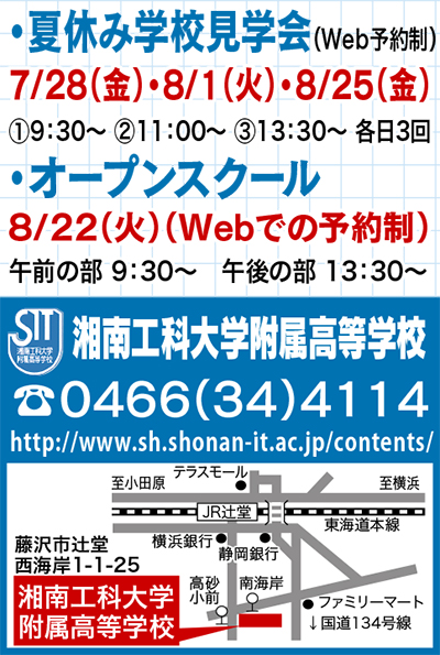 受験生にとっては本格的な学校選びが始まる夏休み。湘南工科大学附属高校は、学校見学会・オープンスクールを左記日程で開催する。対象は、同校へ関心がある中学生と保護者。