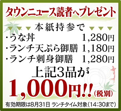 大好評につき期間延長!タウン読者にランチの天ぷら御膳と刺身御膳、うな丼が1000円になるクーポンをプレゼント。ぜひ、一度食べてみては。