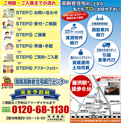 「湘南をさらに住みやすく」をモットーに、創業40年以上の実績を誇る「ユーミーらいふグループ」からこの程新たなサービスが登場。グループ企業の一つである「株式会社神奈川福祉経営研究所」が地元・藤沢エリアをはじめとする湘南エリアにお住まいの「高齢者のくらし活性」を目的とした「湘南高齢者住宅紹介センター」を開設します。