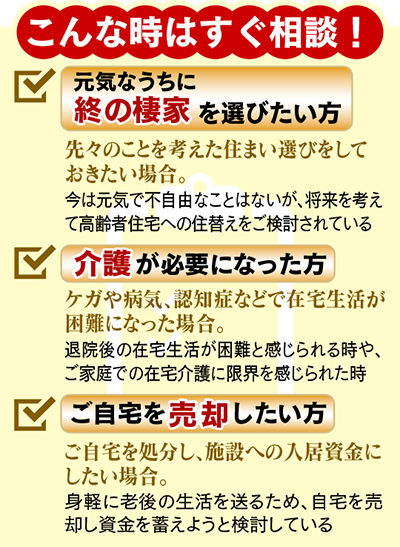 「高齢者住宅に入居したいけれど、何から始めてよいのやら…」といった方や「自分で色々を調べてみたが情報量が多すぎて何を基準にすべきか分からない」という方、またご両親の終の棲家選びなどに奔走されている介護者の方も、ぜひお気軽にご利用下さい。