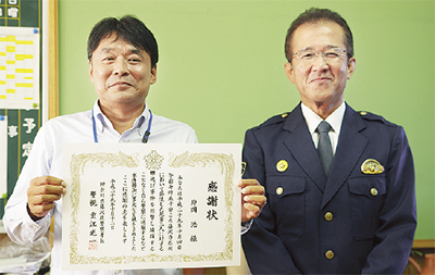 ひき逃げ事件の犯人検挙に尽力したとして、藤沢北警察署が秋葉台中学校で10月12日、同校事務職員の片岡浩さん(56)に感謝状を贈呈。重江光一署長から片岡さんへ手渡された。