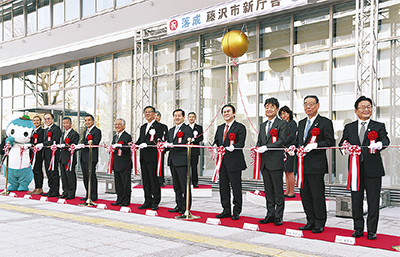 建物の老朽化などを理由に、建て替え工事が進められてきた藤沢市役所新庁舎が完成し、落成式が12月16日、同庁舎1階で行われた。式典には、関係者約160人が参加し、新庁舎の新たな門出を祝った。