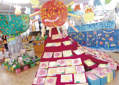 年少は海の生き物やみかんの木など、遊びの延長で様々なものを表現。年中はクラス合同で絵本『スイミー』の世界観を制作。年長は「ジャングル」をテーマにクラスごとにゴリラやワニなどを作り、一つの大きな作品を完成させた。