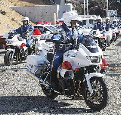 この日は白バイ13台、パトカー5台などが整列し、同署の重江光一署長の号令で一斉に警らに出発。重江署長は「藤沢北警察署管内では昨年2月上旬、立て続けに2件死亡事故が発生した。今年は白バイなどの機動力をさらに駆使し、事故を防ぎたい」と語った。