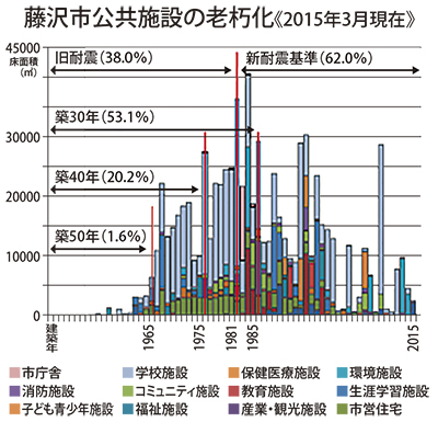 330施設、1227棟、延べ床面積約76万平方メートル。これは学校や公民館、図書館など、藤沢市内にある公共施設に関する数字だ(病院・下水道施設を除く/2015年3月現在)。