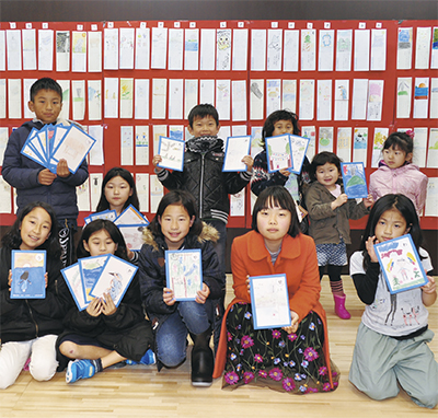この取り組みは、藤沢市郷土歴史課と「昔の遊びを伝える会」との協働事業で、昨年11月に市内小学校にチラシを配布して、作品を募集。色鉛筆やサインペン、絵の具などで描かれた全216点が寄せられ、江の島の「え」や、藤沢や富士山を紹介する「ふ」の作品が目立った。
