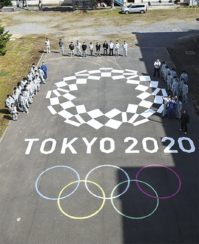 県土地家屋調査士会湘南第一支部による出前授業が13日、藤沢工科高校で行われ、総合技術科都市土木系の2年生36人が同校の中庭に東京五輪のシンボルマークを描いた。