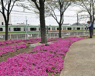 JR辻堂駅近くの「さくら広場」(茅ヶ崎市本宿町)で芝桜が見頃を迎えた。満開の花が紫色の絨毯を形作っており、車窓から見える沿線の風景に彩りを添えている。