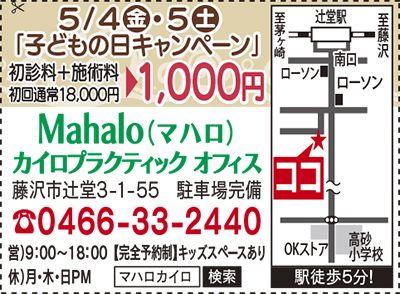 辻堂にある「マハロカイロ」の太田院長は元Jリーガー。丁寧な問診とレントゲンなどの細かな検査で症状の根本原因を見つけ、独自の手技で改善へと導いてくれる。子どもの頃からプレーしてきた経験からも「怪我の予防やパフォーマンス向上には幼いうちからのケアがとても重要です」。5月4・5日には「子どもの日キャンペーン」も実施!ぜひ足を運んでは。