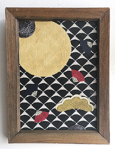 第1弾として発表した作品は「月夜二扇子舞フ」。紺色の浴衣をベースに、黄色の半帯を月に見立て、アクセントとして赤の舞う扇子をあしらい、花札の世界観を表した。出水澤さんが売り物にならない着物を提供し、デザインなどを手掛ける関根さんが作品として仕上げた。フレームには鎌倉の古民家の建具を使用している。