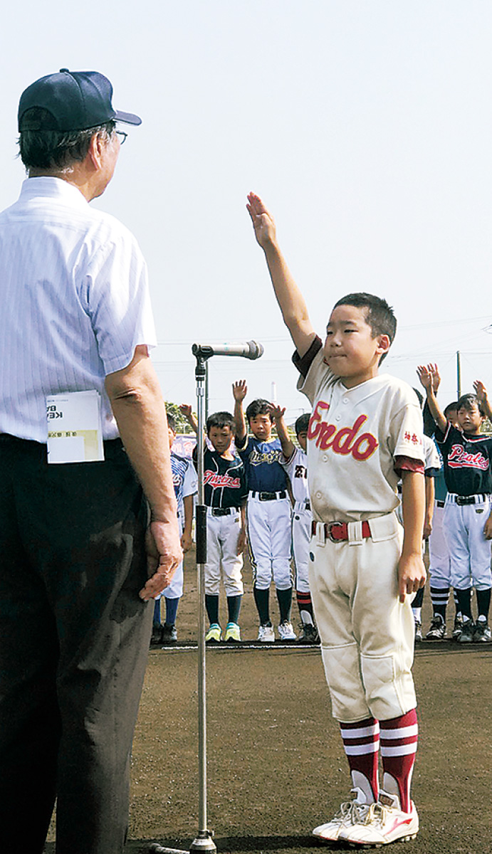 市野球協会が主催して、幅広い世代が野球で交流できるようにと毎年開かれている大会。試合前に遠藤少年野球クラブ主将の武藤綴平(てっぺい)くんが選手宣誓を行い、フェアプレーを誓った。