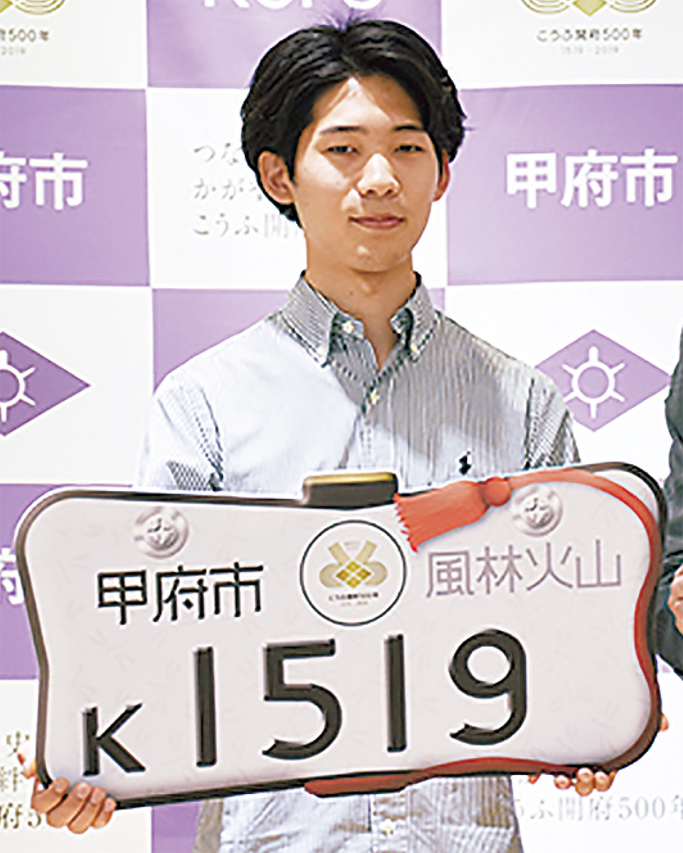 湘南台在住で慶応大学(SFC)3年の志村敢人(かんと)さんがデザインしたナンバープレートが山梨県甲府市で採用されることが決まった。同市では来年開府500年を迎えるにあたって、原付バイク(125cc以下)のナンバープレートのデザインを昨年11月から4カ月間公募。全国から501作品の応募があり、志村さんの作品が最優秀賞に選ばれた。
