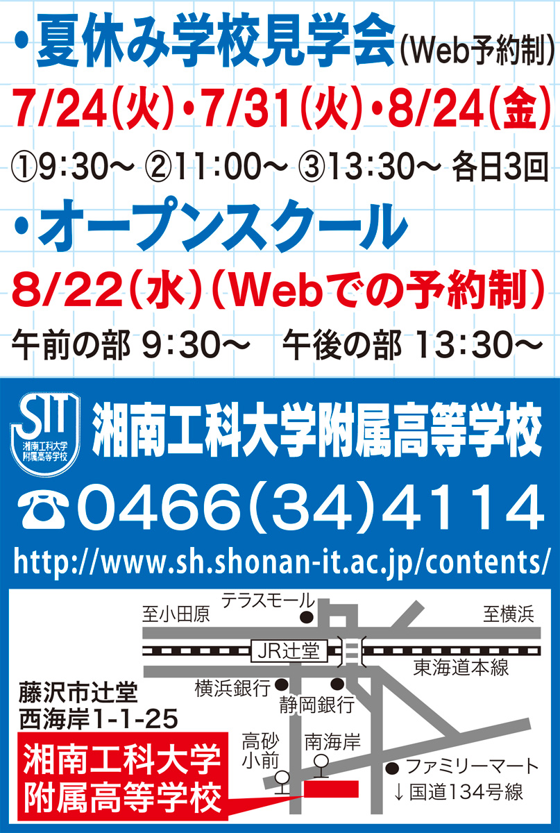 受験生にとっては本格的な学校選びが始まる夏休み。湘南工科大学附属高校は、学校見学会・オープンスクールを左記日程で開催する。