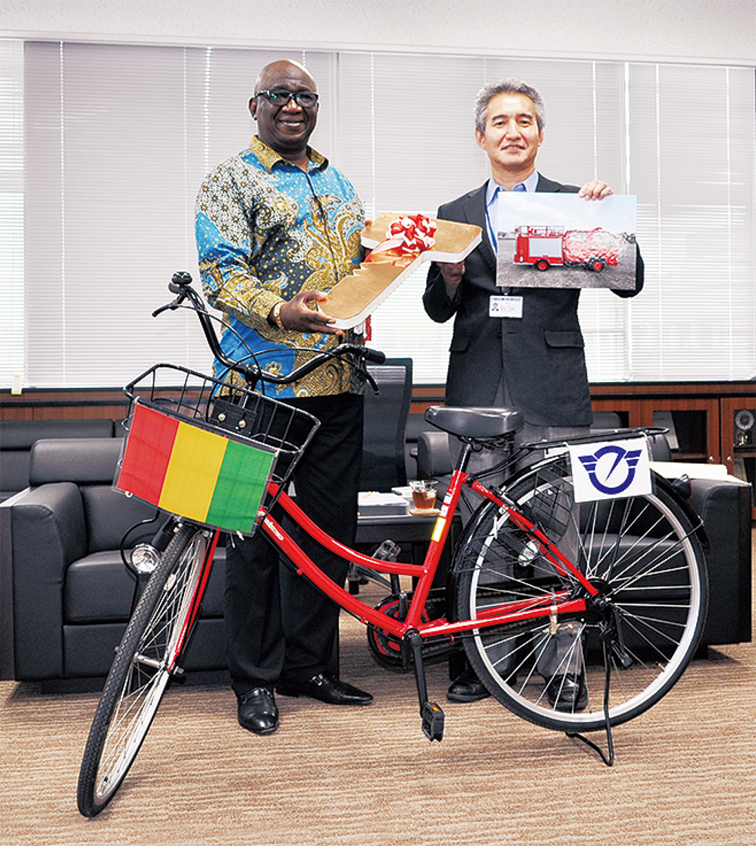 先月26日には寄贈式が本庁舎で行われ、宮治正志副市長からギニアのセンクン・シラ大使にギニア国旗と藤沢市のマークがあしらわれたサンプル自転車と、消防車のレプリカキーが手渡された。