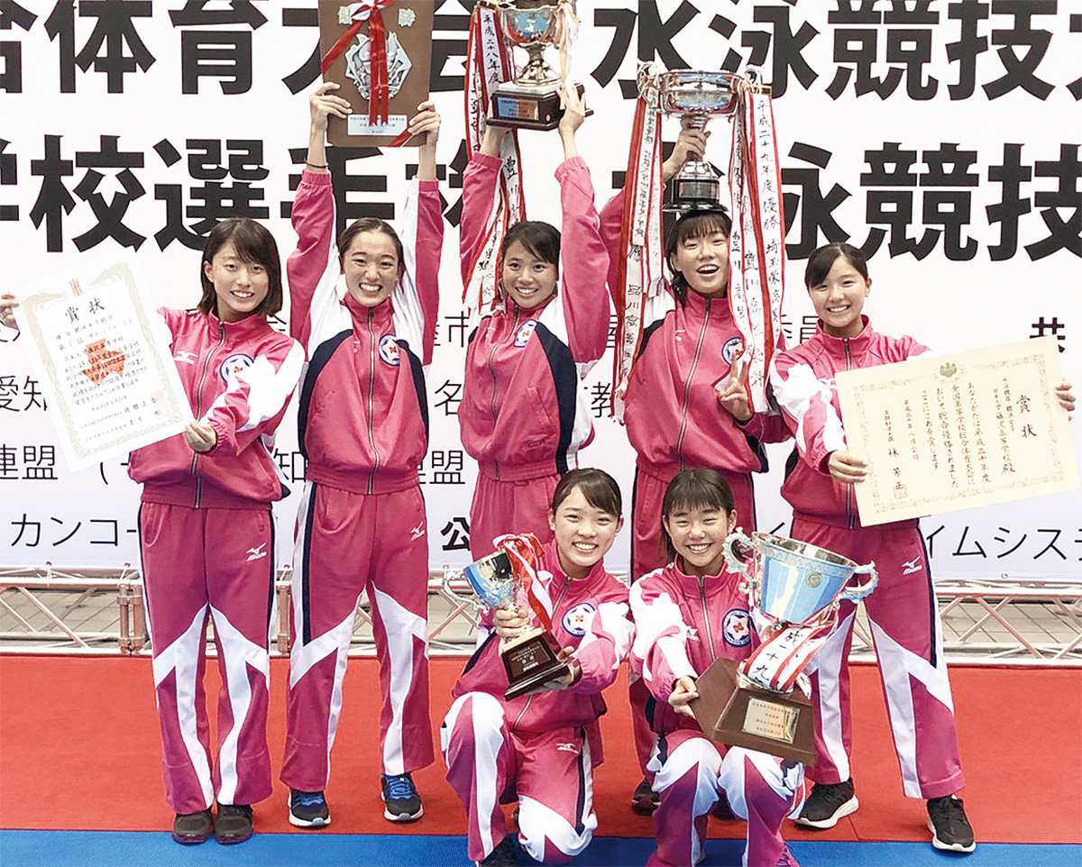 同校は、個人種目で大内紗雪さん(2年)が100m・50m自由形の2種目、城戸佑菜さん(2年)が100m背泳ぎで優勝。主将の佐々木杏奈さん(3年)が200m・400m個人メドレーで3位に輝いた。