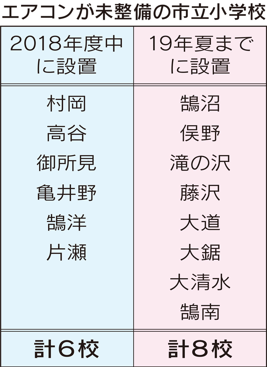 藤沢市は27日、市内35ある小学校の普通教室の空調設備整備を来年5月末までをめどに完了させる方針を明らかにした。未整備だった残り14校のうち、8校は「来年度中」としていたが、今夏の記録的猛暑を受け、計画を前倒す。市は市議会9月定例会に、準備にかかる費用799万2千円を含む補正予算案を提出する。