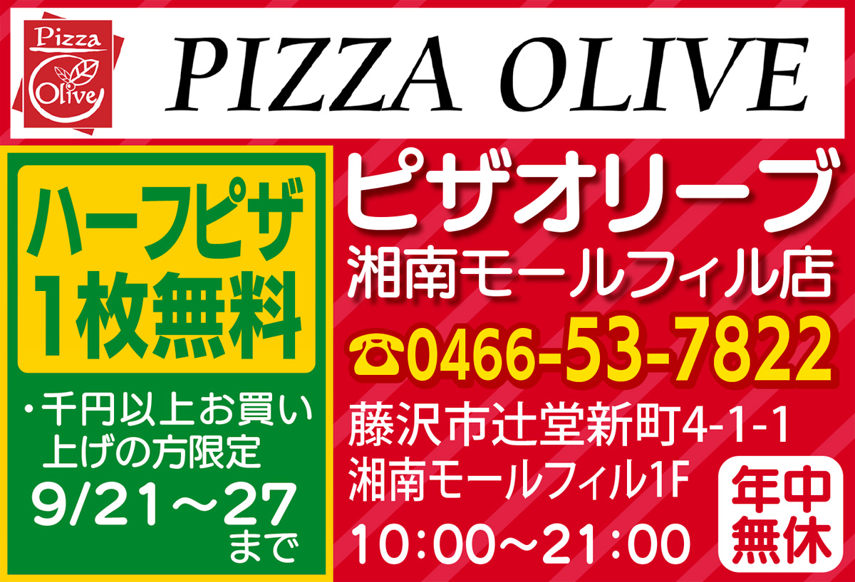 生地から手作りの焼き立てピザを提供するテイクアウトピザ専門店「ピザオリーブ」(湘南モールフィル1F)。人気のマルゲリータや湘南店のみの限定ピザなど、全13種類とメニューが豊富で、Mサイズ(1・5人前)が1080円からとお手軽な価格も魅力。ハーフサイズも購入ができる。