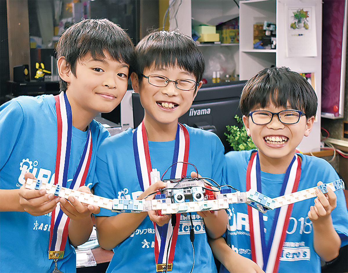 ロボットが好きな荒井くんと梶浦くん、プログラミングに興味のあった功刀くん。3人は同じパソコン教室に通い、切磋琢磨しながら勉強に励んでいる。将来は農業で人手不足になった時にロボットを使うなど、人の助けになるものを開発したいという。