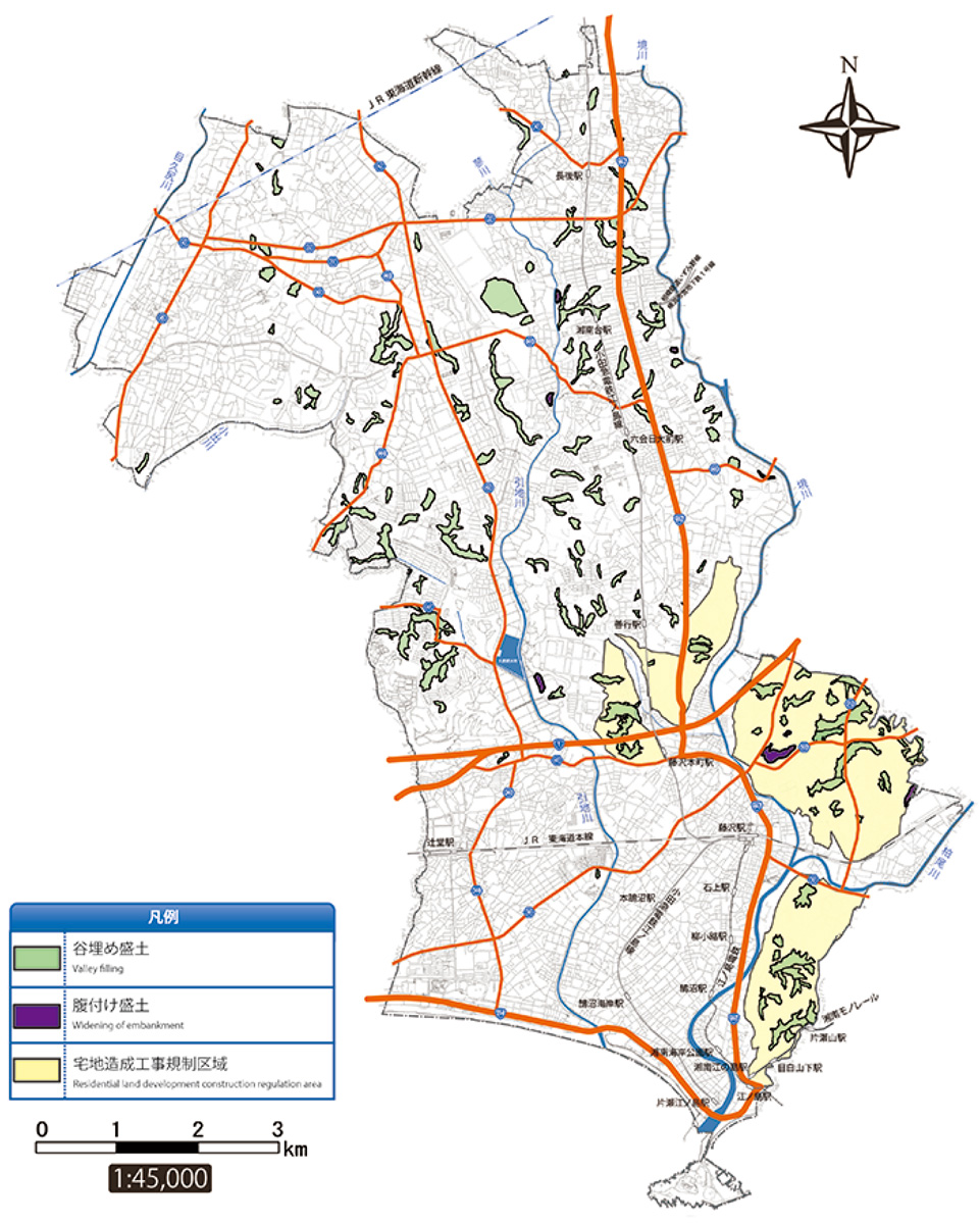 藤沢市はマップの作成にあたり、1955(昭和30)年に作成された地形図と2015(平成27)年の地形図を重ね合わせ、約2m以上の盛土がされている場所を抽出しマップに掲載。盛土されている場所は、市内全域で182カ所に及び、市によると県内でも横浜市、川崎市、横須賀市、鎌倉市に次いで5番目に多いという。マップには、谷を埋めた「谷埋め型」、山の斜面に土を盛った「腹付け型」で色分けをしてある。