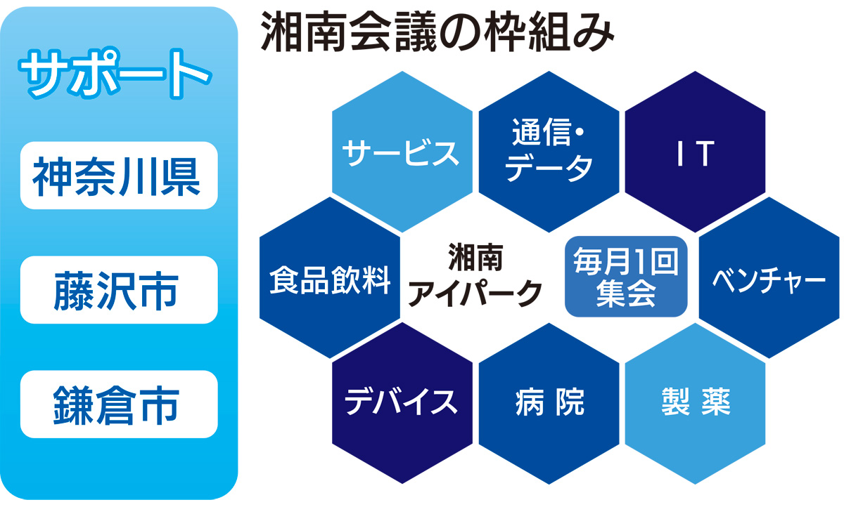 湘南会議は神奈川県や藤沢市、鎌倉市の支援を受けて発足。異業種の民間企業が情報共有しながら横断的に製品開発などに取り組むことで、スピード感ある事業展開を目指す。