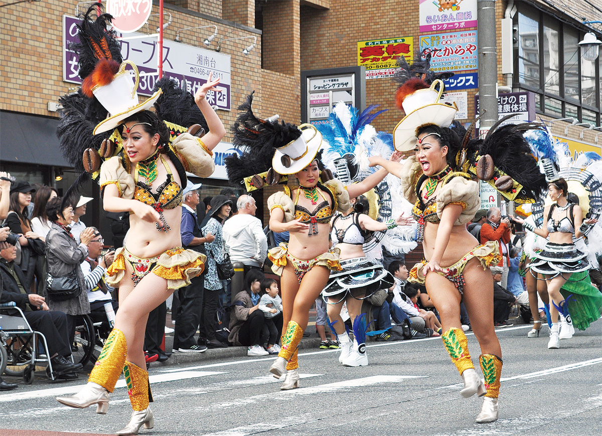 特に盛り上がったのが、28日に行われた名物の大パレード。地元からは園児の鼓笛隊や全国大会常連の湘南台高校吹奏楽部マーチングバンドが、さらに毎年注目される国内最高峰と言われる浅草サンバカーニバルの優勝チームなども参加し、およそ700人が駅の東西を練り歩いた。