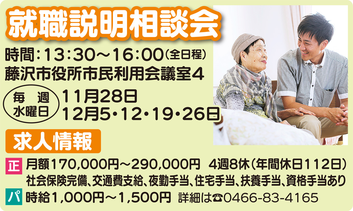 同施設では毎週水曜日に市役所市民利用会議室4で「就職説明相談会」を開催する。就業や介護の仕事についての相談、転職するチャンス。お気軽にご参加を。