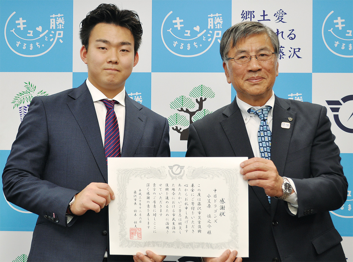 藤沢市出身でプロ野球・中日ドラゴンズの小笠原慎之介投手(21)が10月、市の災害復興基金に100万円を寄付したことを受け6日、市から感謝状が贈呈された。