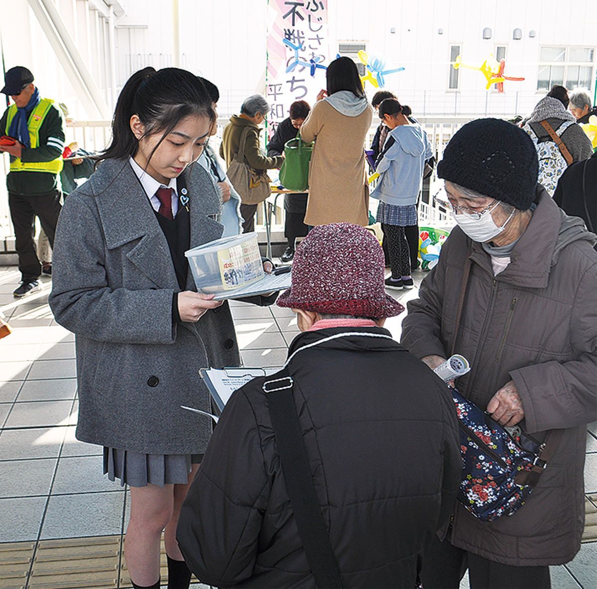 今回は全国展開されている「高校生1万人署名活動」に加わる高校生3人も参加=写真。通行人に核廃絶の署名を求めた。横浜国際高校2年の山尾みるさん(17)は昨年、高校生平和大使の一員としてスイス国連欧州本部に署名を届けた。「『微力だけど無力じゃない』というスローガンの通り、ひとり一人の意識が変われば結果も変わる。私のような高校生だからこそ、伝えられることがあると思う」と話した。