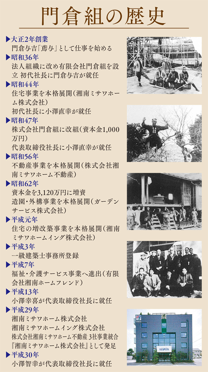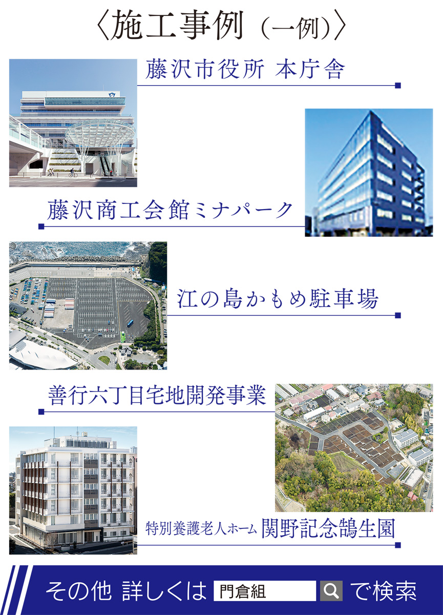 創業106年の歴史を持つ総合建設会社「(株)門倉組」(辻堂元町4の17の22)。従来の公共工事、集合住宅や商業施設の建設などに加え、近年では高齢者施設の新設や建物のリノベーションなど、時代に応じた事業にも力を注ぐ。老舗企業としての歴史を刻みながら「まちを愛する」「人に役立つ」ことを理念と掲げる同社。昨年5月、第4代目社長に就任した小澤智幸氏(46)に今後のビジョンについて話を聞いた。