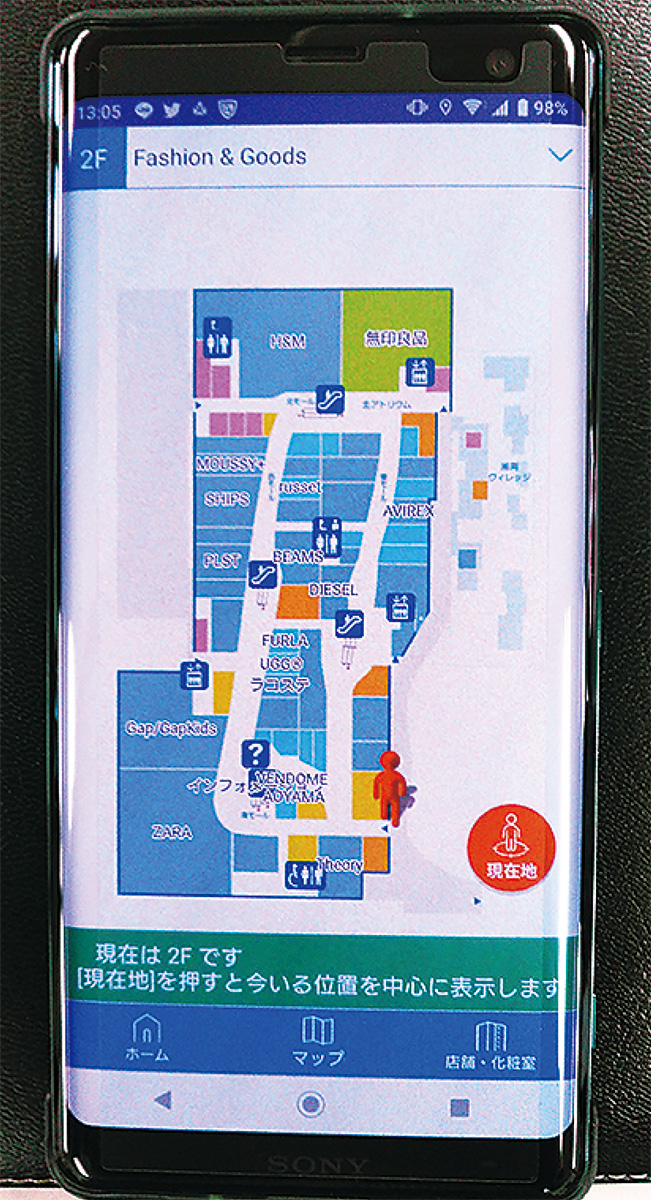 施設案内アプリは、ビーコン(発信機)と位置情報システムを通じて利用者を目的地まで案内する仕組み。自動車部品メーカーの「デンソー」が開発した。施設内で目的の店舗名をタッチすると、画面で目的地までのルートが表示される。