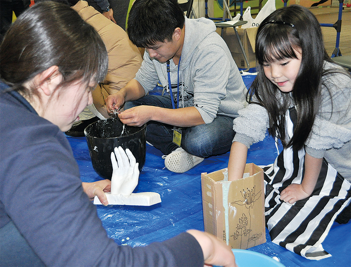 アスリートのグローブを作る研究会のブース「手型とり体験」=写真=に参加した三井莉愛さん(7)は「出来上がるのが楽しみ」と学生との会話を楽しんでいた。そのほか参加者らは「SFCの事を今までほとんど知らなかったが、このイベントで体験しながら学生たちとお話しできて一気に距離が近くなれた気がする」と話した。