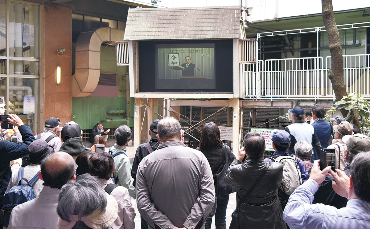 新元号「令和(れいわ)」が1日、発表された。名店ビル一角にあるハゼの木広場の公共テレビでも会見が生放送され、歴史的な瞬間を見ようと会見15分前ほどから人が集まり始め、約100人がテレビ前で見守った。新元号が発表されると、「おー」と驚きともため息ともつかない声が漏れ、スマートフォンでテレビ画面を撮る人などがいた。