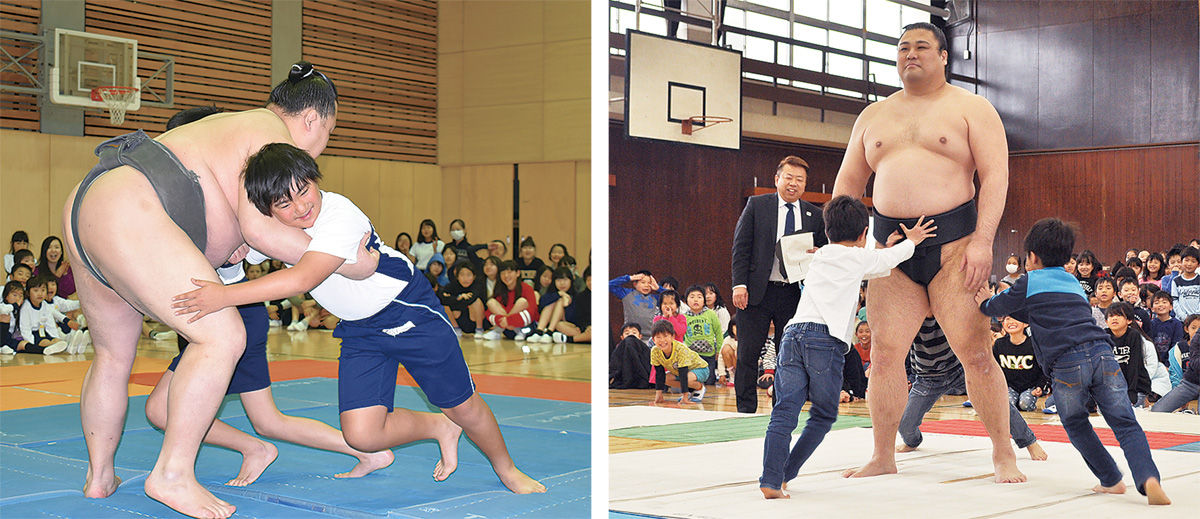 各校には藤沢場所の勧進元、最上重夫さんをはじめ、錣山親方(元関脇・寺尾)、同部屋の彩、寺尾、葵の3力士が訪問。合計1694人の子どもたちと触れ合った。