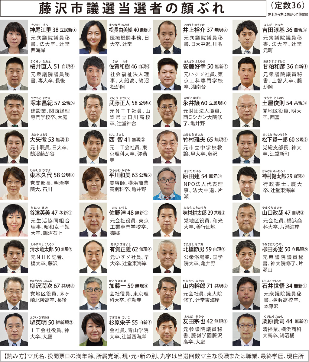 任期満了に伴う藤沢市議選は21日に投開票され、新たな市議の顔ぶれが決まった。今回の選挙は定数36に対して49人が立候補。定数を13人が上回る激戦となった。