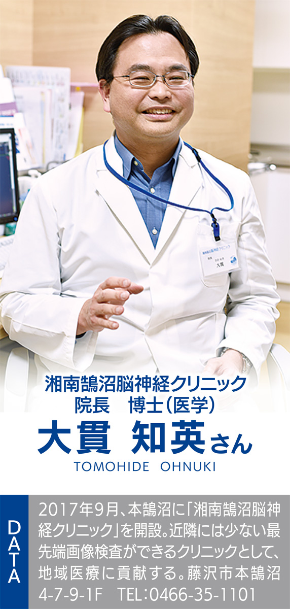 故郷である本鵠沼に「湘南鵠沼脳神経クリニック」を開院して1年あまり。東海大学関連の病院でキャリアを積み、これからの高齢社会には地域から健康で安心な暮らしをサポートすることが重要だと開業医の道を選んだ。「認知症や脳卒中、脳に関わる病気の患者さんは増えていく。地域の窓口として不安や悩みにこたえていきたい」と真っすぐな志を見せる。