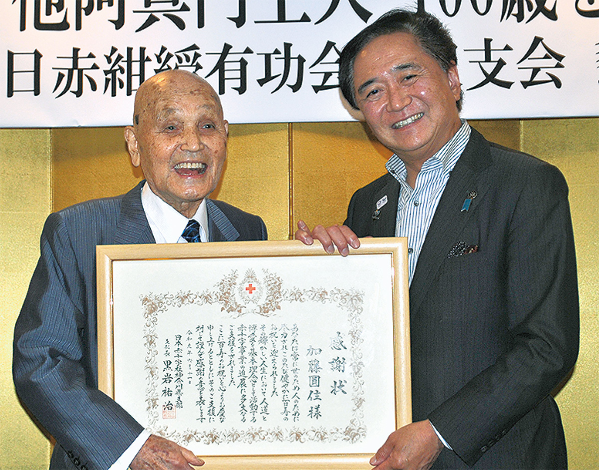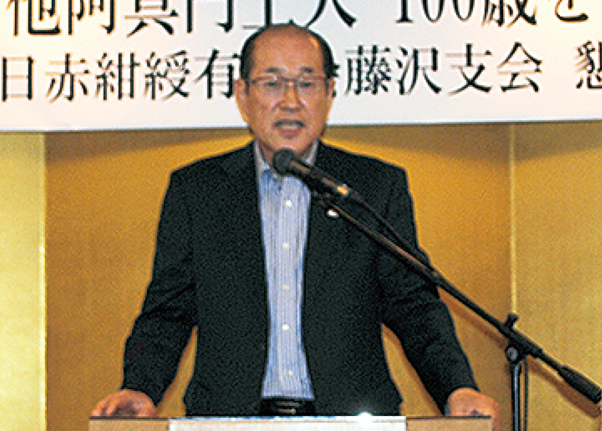 この会は上人が日赤紺綬有功会藤沢支会のメンバーであることから、同支会長の最上重夫氏が発起人となって開催。会の中、真円上人から日赤神奈川県支部への寄付金贈呈式も行われた。