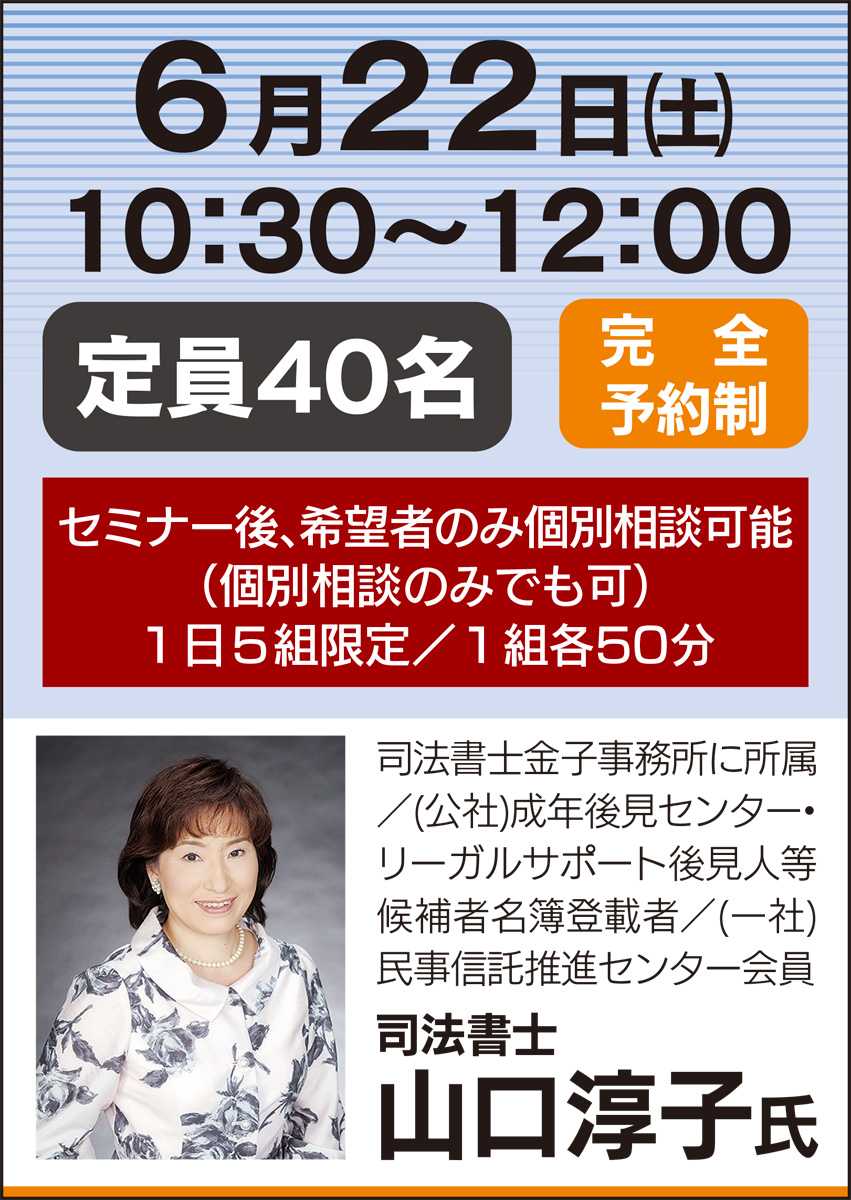 当日は経験豊富な専門家、司法書士の山口淳子氏が登壇。認知症への備えでは、家庭裁判所を通して第三者あるいは親族に財産管理を任せる「成年後見制度」や、信頼できる家族に預ける「家族信託」のメリット、デメリットから選び方をレクチャー。また、認知症発症後にトラブルになりやすい不動産の相続については「親が重度の認知症で自宅の修繕ができない」「施設に入るので実家を処分したい」など、実際の事例を元に対処方法を教えてくれる。「後悔しないための知識を得る機会です。お気軽にご参加を」と同店は呼びかける。