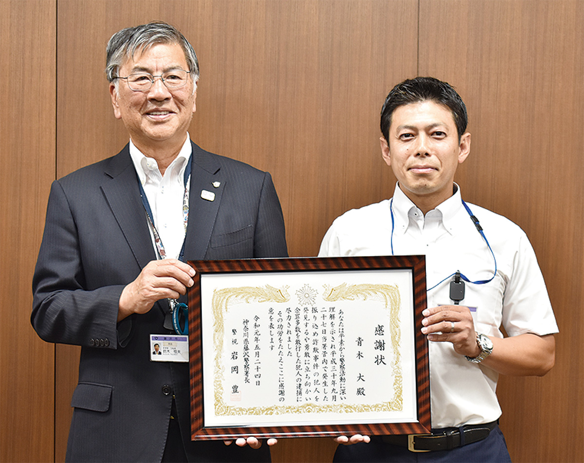青木さんは昨年の9月27日、自宅付近で不審者を発見。その直後、近所の顔見知りの男性から声をかけられ、「家族が銀行のカードを見知らぬ人に手渡してしまった。怪しい人を見なかったか」と尋ねられた。やりとりに感づいた不審者が逃げる素振りを見せたため、青木さんは約70m追跡。身柄を拘束するとカードの受け子だったことが判明したため、藤沢署に引き渡した。