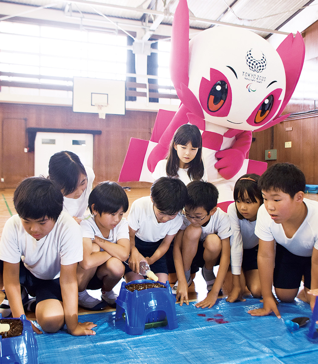 「植育」の授業ではアース製薬の職員が害虫の駆除や水やりのコツなどを教え、「一年生のときに育てたと思うけど、もっときれいな花を咲かせてみよう」と話した。その後、児童の手で種まきが行われ、東京五輪マスコットのミライトワとソメイティが見守るなか、植木鉢に培養土を盛り、穴をあけて種をまき、水やりをした。