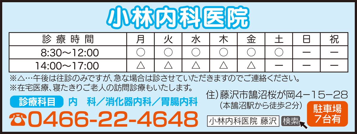 小田急線本鵠沼駅から徒歩2分の場所にある「小林内科医院」。院長の小林純二郎医師は、地域に根ざしたホームドクターとして父の代から65年、市民の健康を守り続けてきた。明るい雰囲気の院内は、小林院長の笑顔と穏やかな人柄がにじみ出ている。
