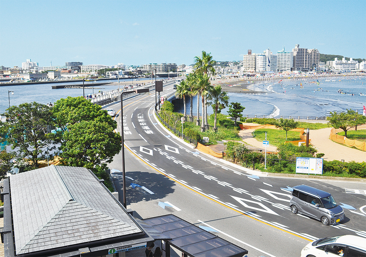 事業区間は江の島大橋(324m)を含む約900m。橋部分は幅を1・4m拡幅し、中央分離帯をなくすことで江の島方面に向かう道路を1車線から2車線に増やした。両方向の車道に沿って、自転車専用レーンも新たに設けた。